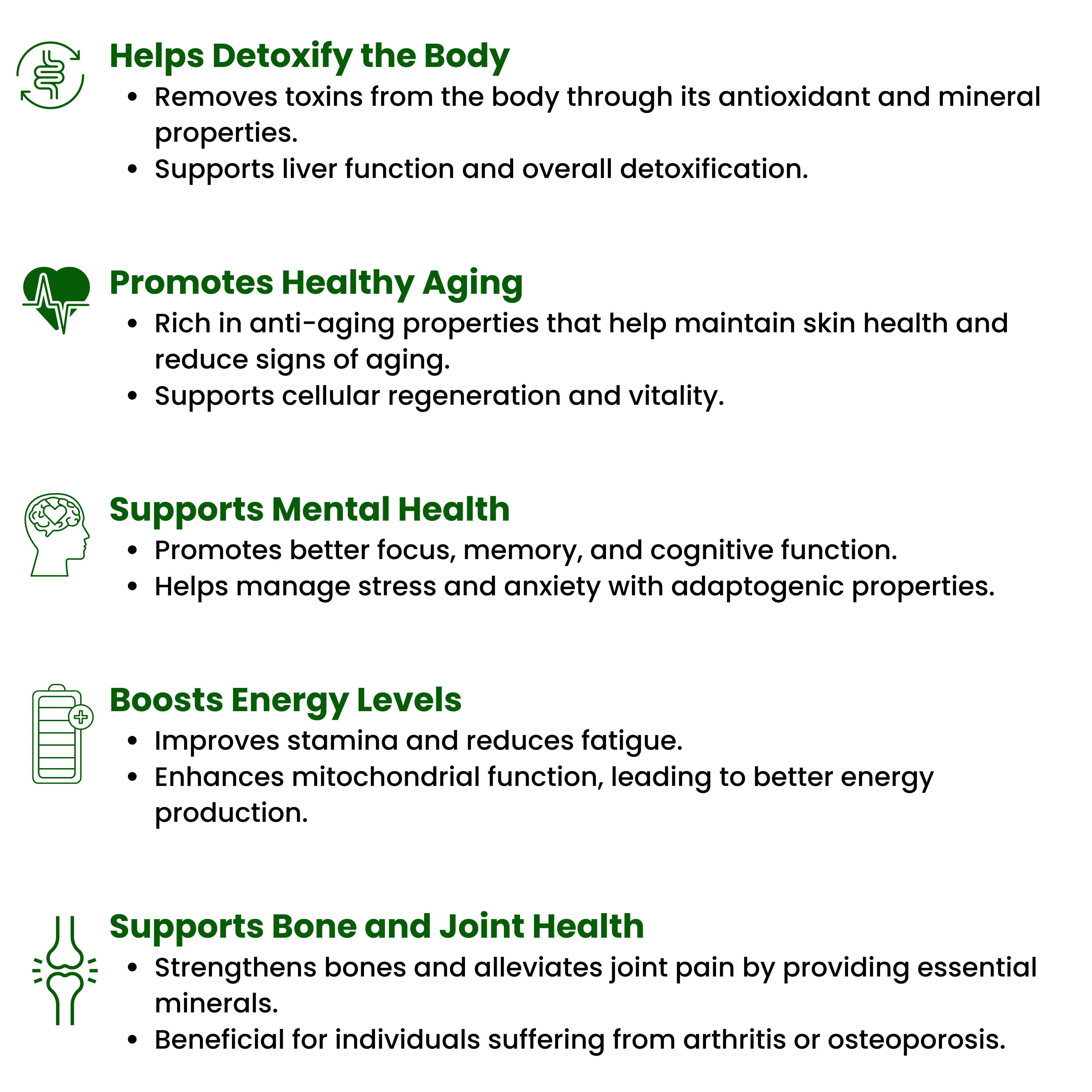 - Shilajit Extract (Fulvic Acid 40%): Enhances energy, stamina, and performance.